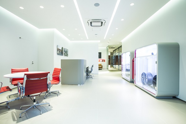 Using the latest CI of Ferrari, Cornes Shinonome Service Center welcomes customers in the reception area and lounge space, sophisticated spaces with white as the base color. The new center has about 1,300sqm of dedicated work space to keep Ferraris in the best condition, and features the widest work bay area in Japan, comprising 14 work bays, the largest number in Asia. A rich variety of equipment is in place ranging from the tester for the latest model to jigs that can be used for models from each era, enhancing its ability for after-sales service to twice more than the current ability at Shiba Service Center in Tokyo.